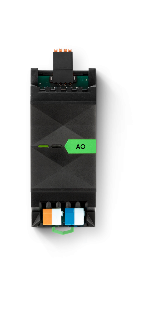Die AO Extension bringt 4 analoge 0-10V Ausgänge auf nur zwei Teilungseinheiten mit sich – perfekt zur Übertragung analoger Steuersignale im Bereich 0-10V.
